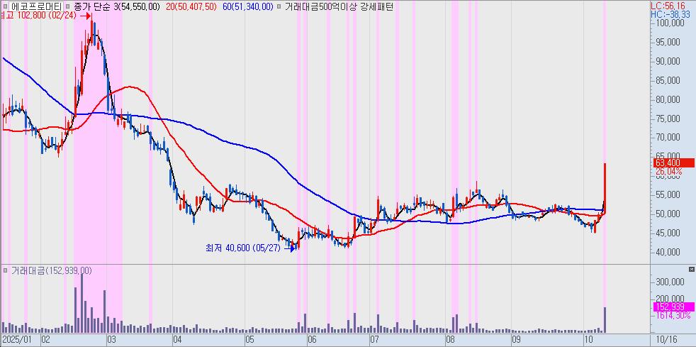 2025년 10월 현재 에코프로머티의 주가는 약 63,000원대에서 움직이고 있습니다. 지난 1년간 52주 최고가는 124,000원, 최저가는 40,600원으로, 상반기 고점 이후 큰 폭의 조정을 거친 상태입니다.