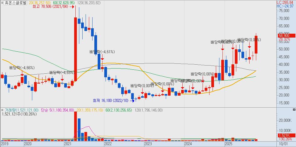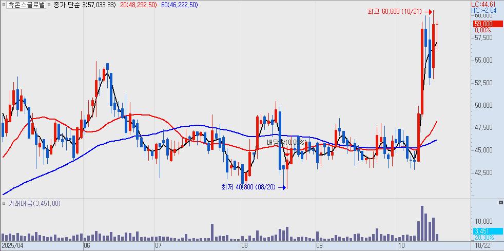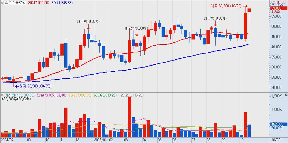 2024년 4월 최저가 20,200원을 기록했던 휴온스글로벌 주가는 2025년 10월 현재 56,900원 수준까지 상승했습니다. 52주 최저가 대비 3배 가까이 오르며, 조용하지만 강한 반등세를 보였습니다.