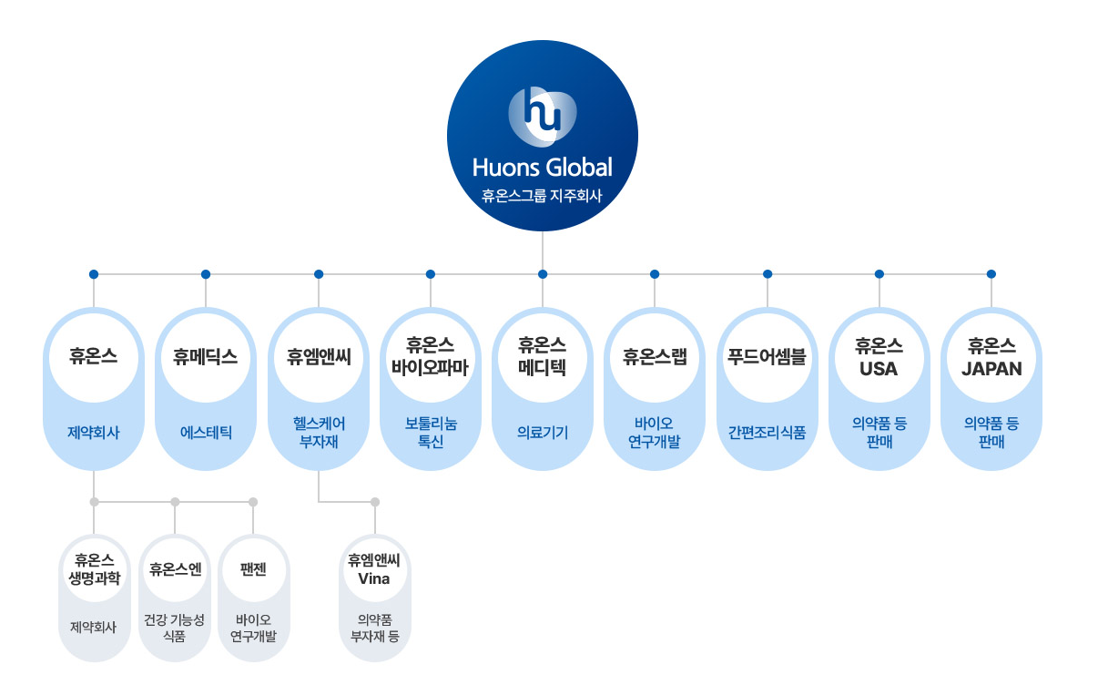 휴온스글로벌은 1965년 설립된 토털 헬스케어 그룹의 지주회사입니다. 주요 자회사로는 휴온스, 휴메딕스, 휴온스네이처, 휴엠앤씨 등이 있으며, 제약·의료기기·건강기능식품 등 다양한 영역을 아우르고 있습니다.