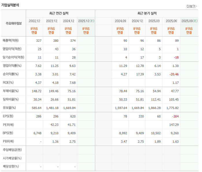 2025년 1분기 실적은 매출 약 75억 원(전년 대비 +4.5%), 영업이익 약 5억 원(전년 대비 +443%)으로 실적 개선세를 보였습니다. 기술력과 생산 효율성 향상, 그리고 신규 고객사 확보가 긍정적인 요인으로 작용했습니다.