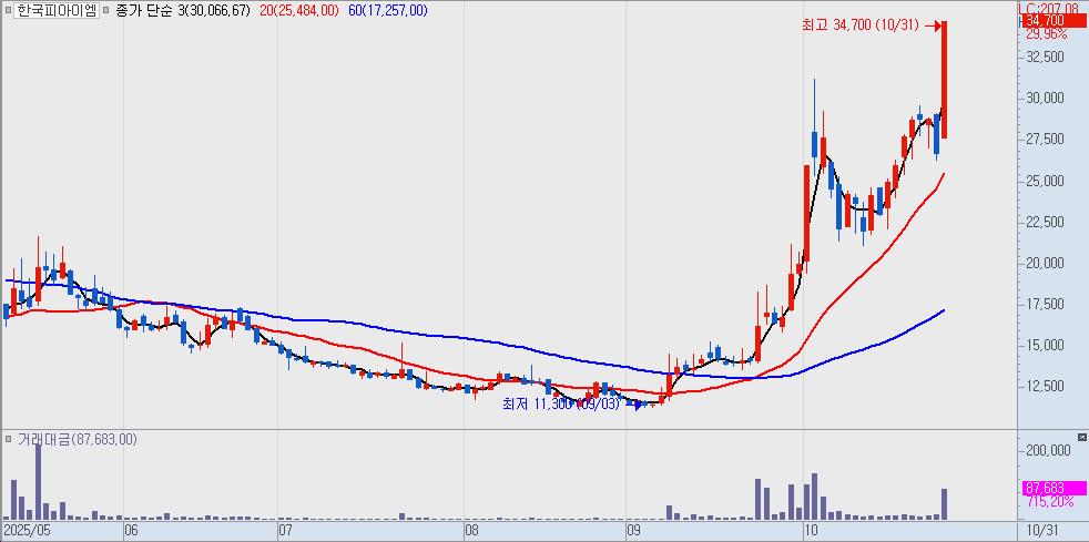 2025년 10월 31일 기준, 한국피아이엠 주가는 전일 대비 +29.96% 상승한 34,700원에 마감했습니다. 이는 거래량 급증과 함께 52주 최고가를 경신한 수치입니다.