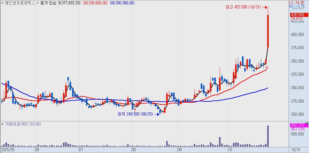 2025년 10월 31일 기준, 레인보우로보틱스 주가는 전일 대비 +24% 이상 상승하며 단기 급등세를 이어가고 있습니다.