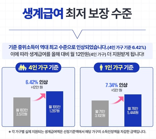 - 생계급여: 소득이 최저생활비 이하일 경우 정부에서 생활비 지원