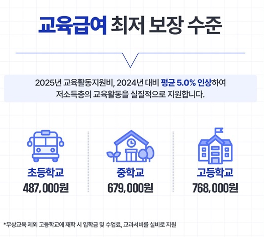 - 교육급여: 초·중·고등학생 학비 및 급식비 지원