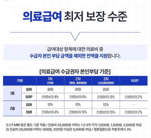 - 의료급여: 병원비 전액 지원 (일부 본인 부담금 있음)