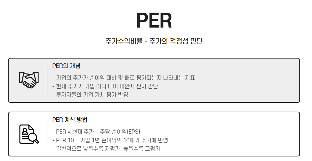 PER(Price to Earnings Ratio, 주가수익비율)은 기업이 벌어들이는 순이익 대비 현재 주가가 몇 배로 평가되고 있는지를 보여줍니다.