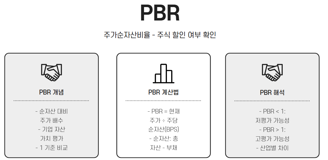 PBR > 1: 주가가 기업의 순자산보다 높게 거래됨 (고평가 가능성)