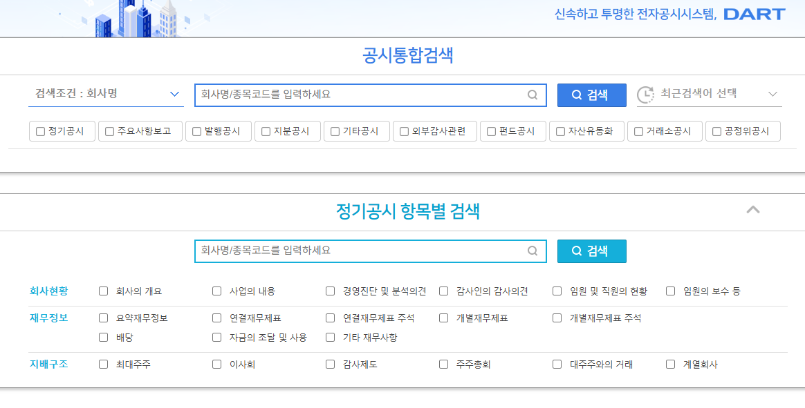 기업명 입력 → 최근 공시 리스트 확인 → 분류별 필터링 가능 - 장점: 모든 공시가 등록되는 공식 시스템, 가장 빠르고 정확함