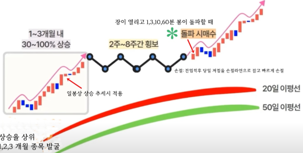 쿨라기의 매매 방식은 상승 추세를 형성한 주식이 조정을 거친 뒤 재상승하는 구간을 매매하는 방식입니다. 이를 위해 그는 다음과 같은 프로세스를 따릅니다.