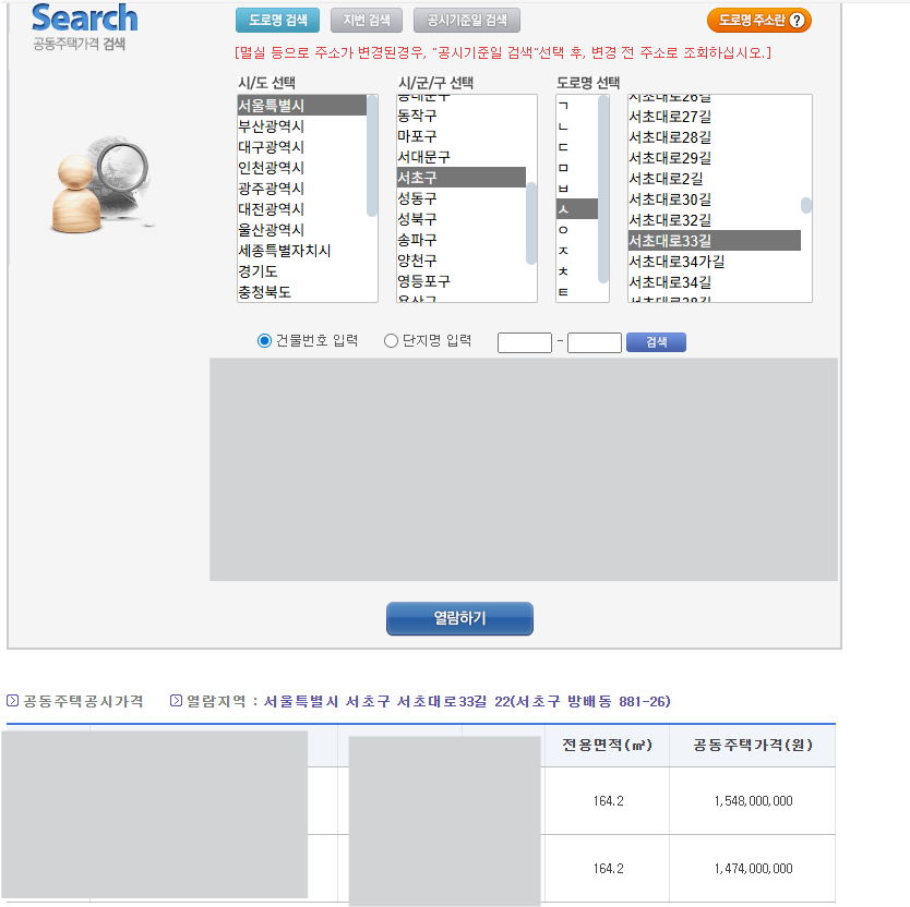 사이트에 접속하면 첫 화면에 조회창이 나타나고, 해당 창에 본인의 부동산 주소를 입력하면 현재 연도의 공시가격이 나타납니다.