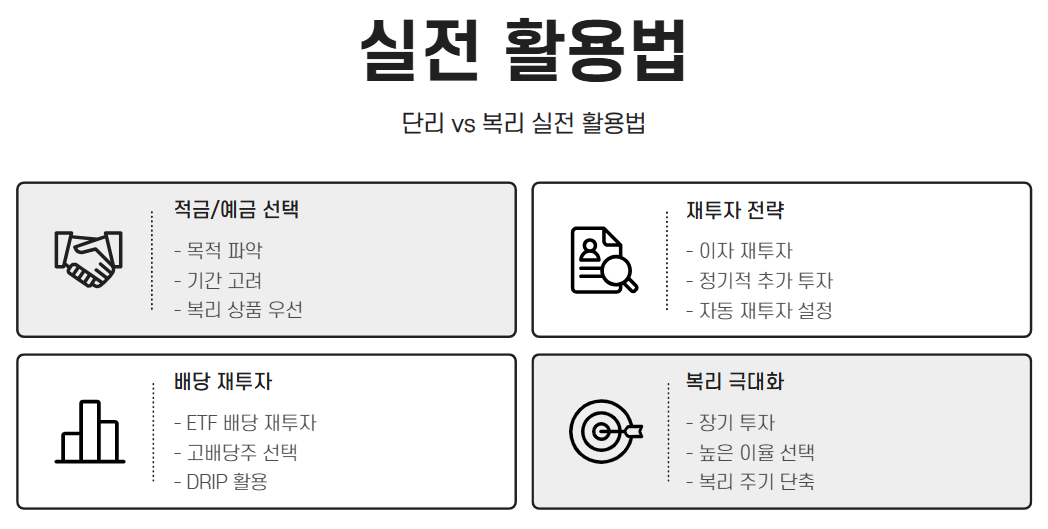 단리 상품이라도 복리 효과를 내기 위해서는 원금과 이자를 다시 투자하는 재투자 전략이 필요합니다.
